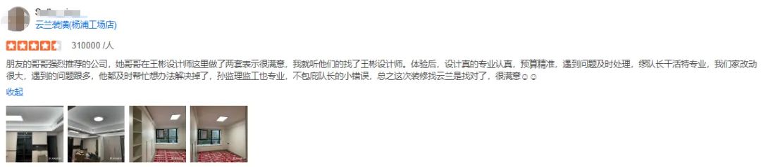 有位客戶找到云蘭整裝可謂一波三折,她通過閨蜜好友的哥哥了解到云蘭整裝,在朋友哥哥的強烈推薦下,又選擇了楊浦店的王彬設計師?!绑w驗后,設計真的專業認真,預算精準,遇到問題及時處理,繆隊長干活特專業,我們家改動很大,遇到的問題跟多,他都及時幫忙想辦法解決掉了,孫監理監工也專業,不包庇隊長的小錯誤!”