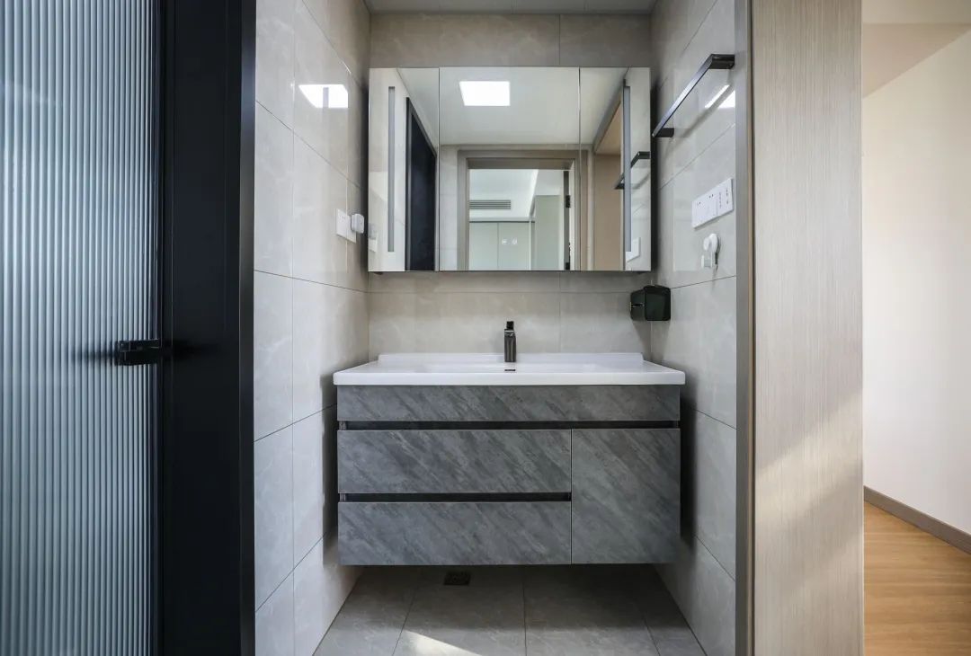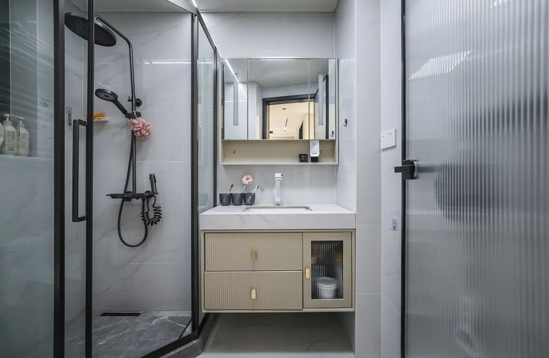 在該衛生間設計中,我們采用干濕分離的布局,配備了90公分的壁掛洗手臺和鏡柜,這樣不僅優化了儲物空間,也提升了整體的美觀度。這一設計充分考慮了客戶在早晨高峰時段對廁所和洗漱設施的雙重需求,確保了高效與舒適并重。