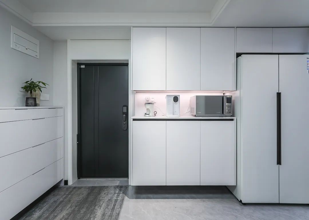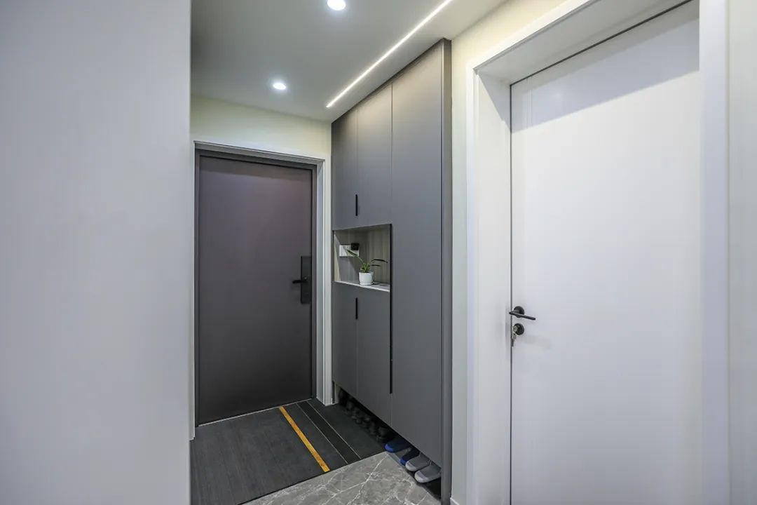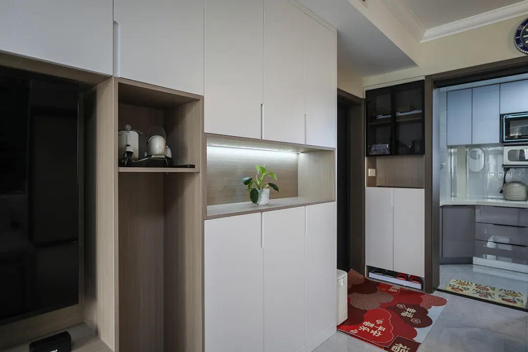 這套房玄關經過我們裝修設計,不僅具備接待客人、換衣、換鞋和放包等基礎功能,還能有效延伸空間,讓玄關區域顯得更為寬敞。此外,玄關柜也可以巧妙地打造成小平臺,用來放置鑰匙等小物品,這樣的設計既實用又增加了居家的裝飾趣味性。