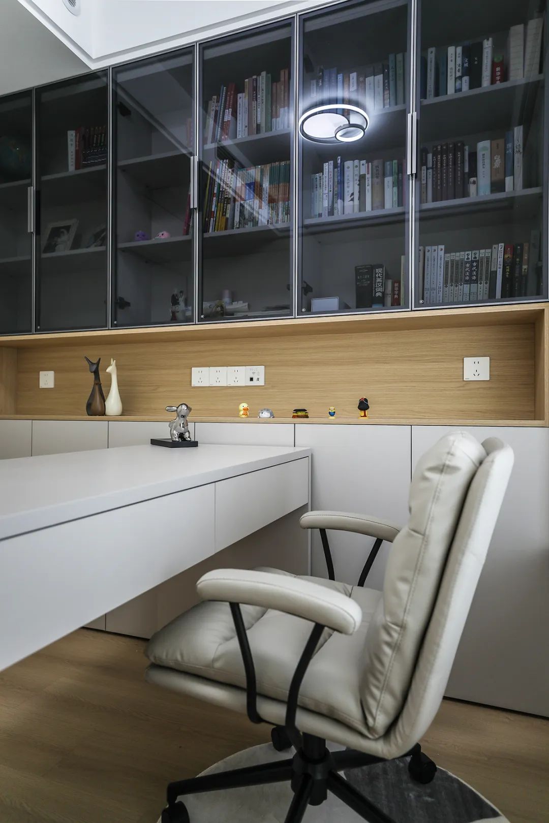 為了滿足業(yè)主居家辦公、閱讀的需求,我們特地通過拆墻改造格局的方式,為業(yè)主書房做出大面積書房空間。并在空間內(nèi)布局了整面墻書柜、創(chuàng)意設(shè)計書桌。書柜柜體分上中下三層設(shè)計,可以非常明晰的做空間規(guī)劃和物品、書籍、展示品分類。