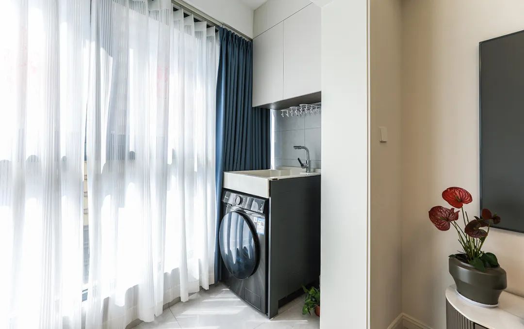 該陽臺地面采用深棕色實(shí)木地板,耐看且實(shí)用。墻面使用白色涂料,并安裝了洗手臺、儲物架。家電以簡約的制品為主,輕便且時尚。整個空間對比強(qiáng)烈、時尚感十足。