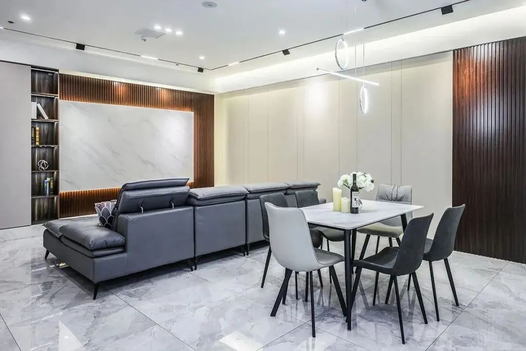 這個裝修案例則采用了極簡風格的設計理念,強調“少即是多”的裝修哲學。在客廳中,我們看到整個空間選用了白色和灰色為主調,沒有任何多余的裝飾。一張簡單的深灰皮質沙發搭配上一張簡約電視柜,再加上綠植作為點綴,整個空間顯得十分簡潔而舒適,讓人們在喧囂的城市中找回了寧靜和舒適的感覺。