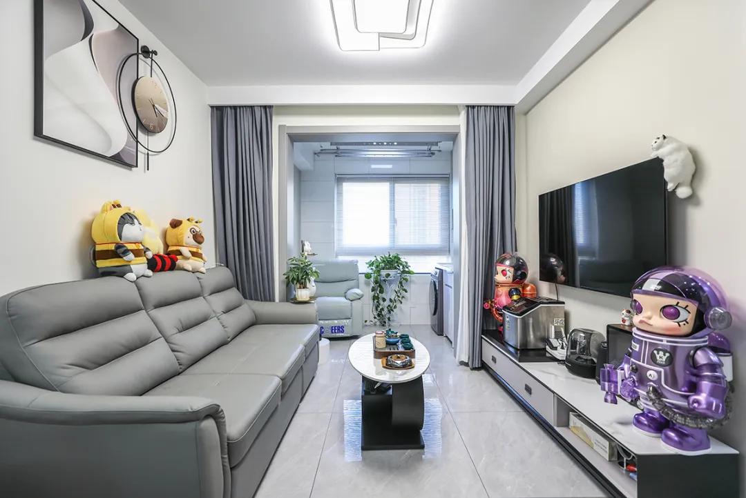現代簡約裝修是當下最流行的設計風格,因為其更符合我們現在的生活方式,其使用的裝修材料也多為當下的工藝制作,日后我們日常添置一些用品也不會違和。這套房子是典型的現代簡約裝修風格,單邊扶手沙發、巖板臺面、對比色高腳椅更強化的現代性。而創意燈具的設計,把客廳區域打造成了類似于舞臺空間,更符合當下年輕人或年輕態的心理需求。