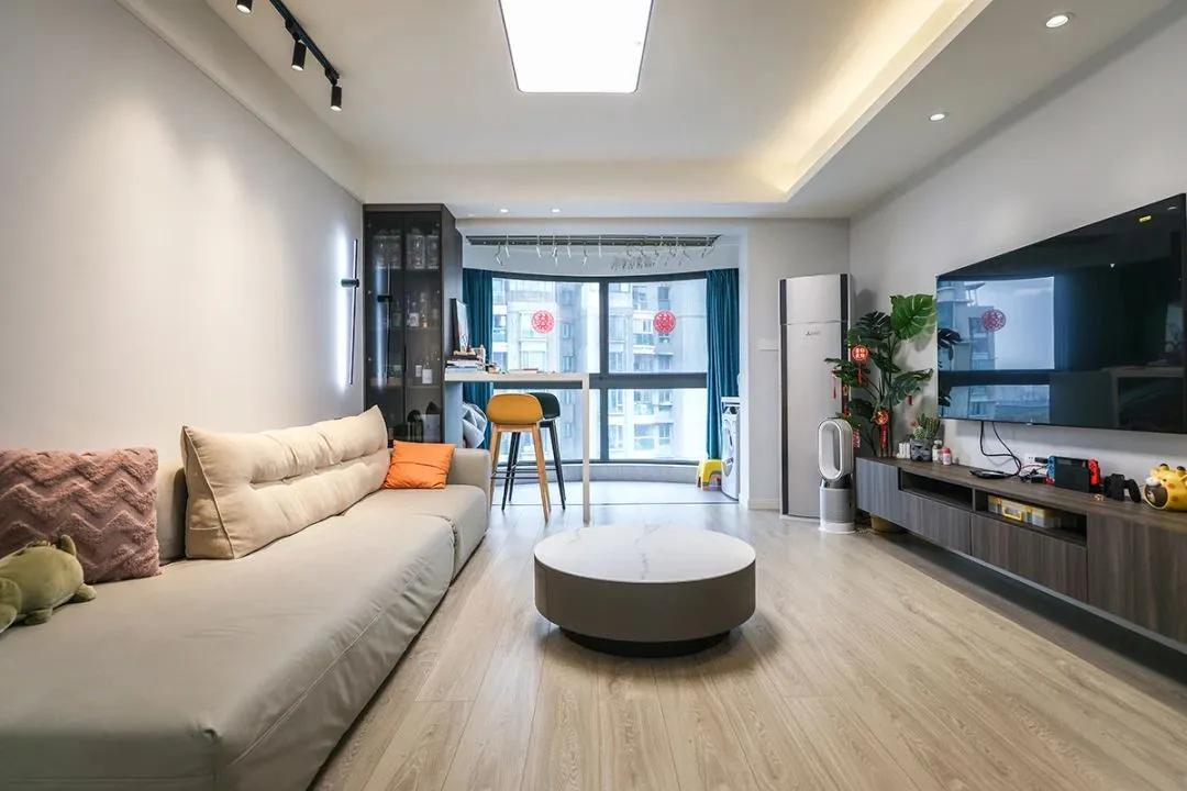 這套房子男主要求寬闊、明亮。我們電視墻采用色彩明亮的幾何墻布,淺灰色皮質沙發配木色方型茶幾加上淺木色復合地板,造型和色調上無不給人以簡潔、大氣、時尚的感覺。