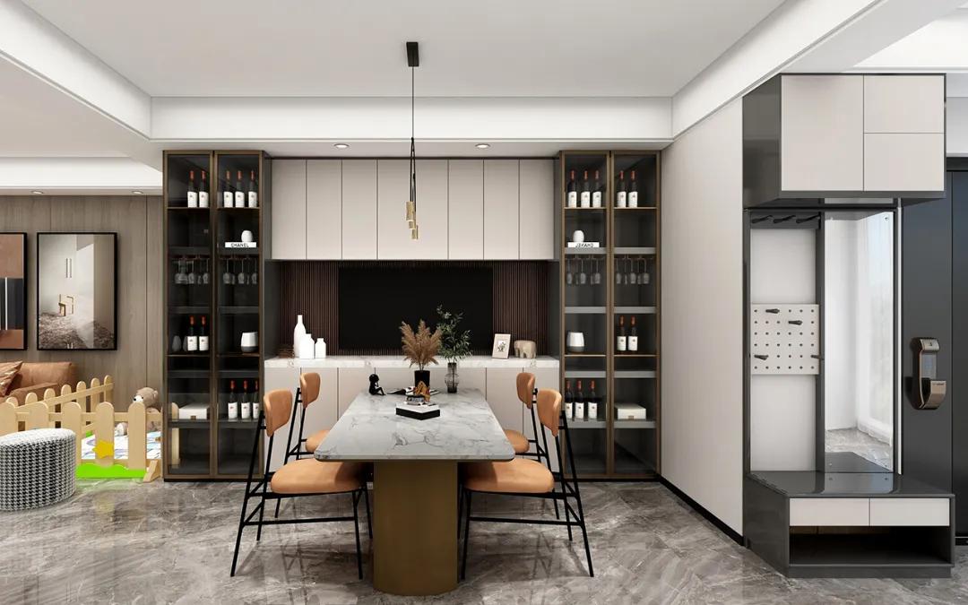 這個餐廳采用客餐廳一體設計,選擇將餐桌和廚房放在同一空間中,但作為兩個獨立的個體,這樣可以更加靈活方便,也可以自由挪動餐桌。這種設計可以促進家人之間的交流,同時開放式的格局可以讓空間更加寬敞。