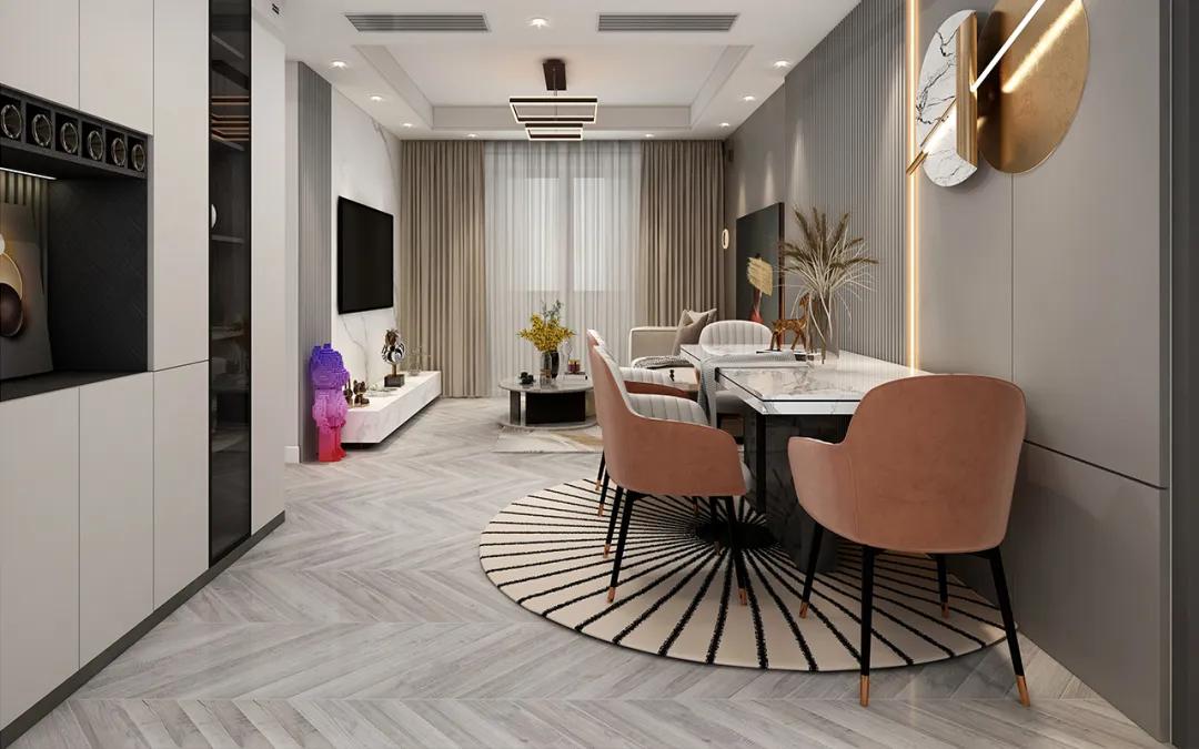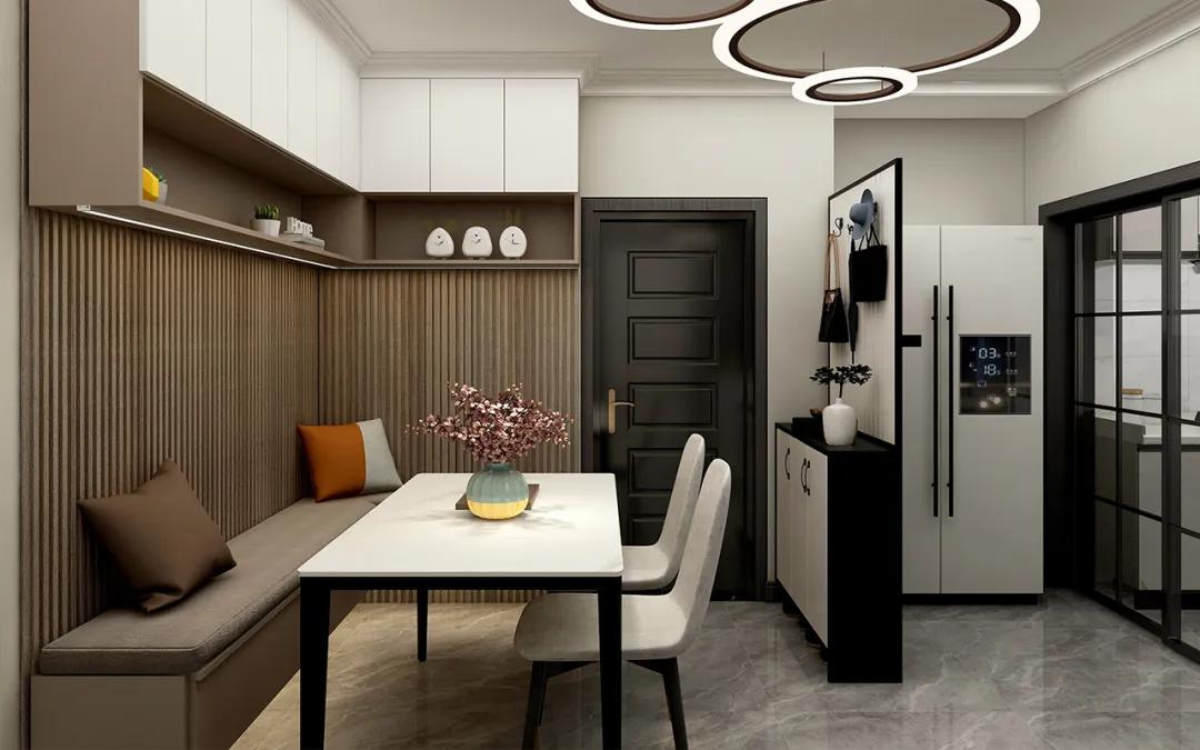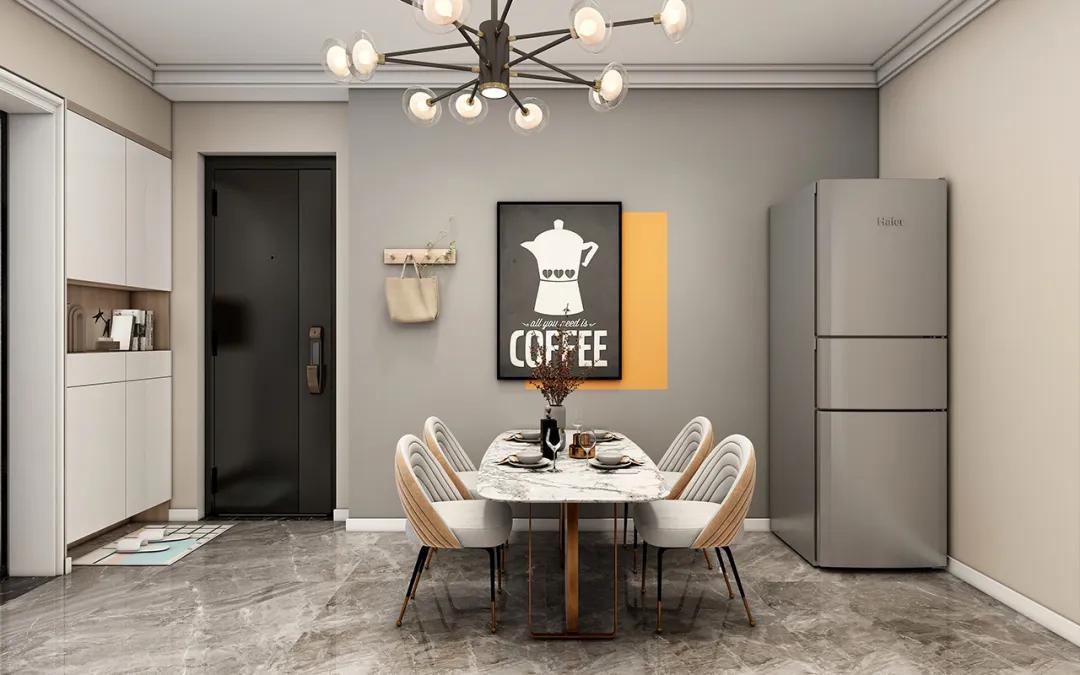 這個餐廳案例采用角落式餐廳,利用入戶進門角落空間設計餐廳。為了更加美觀,我們在選擇餐桌椅時選擇細腿的樣式,視覺上更靈巧。同時,在墻上掛幾幅設計感十足的裝飾畫,以減少視覺上的單一感。
