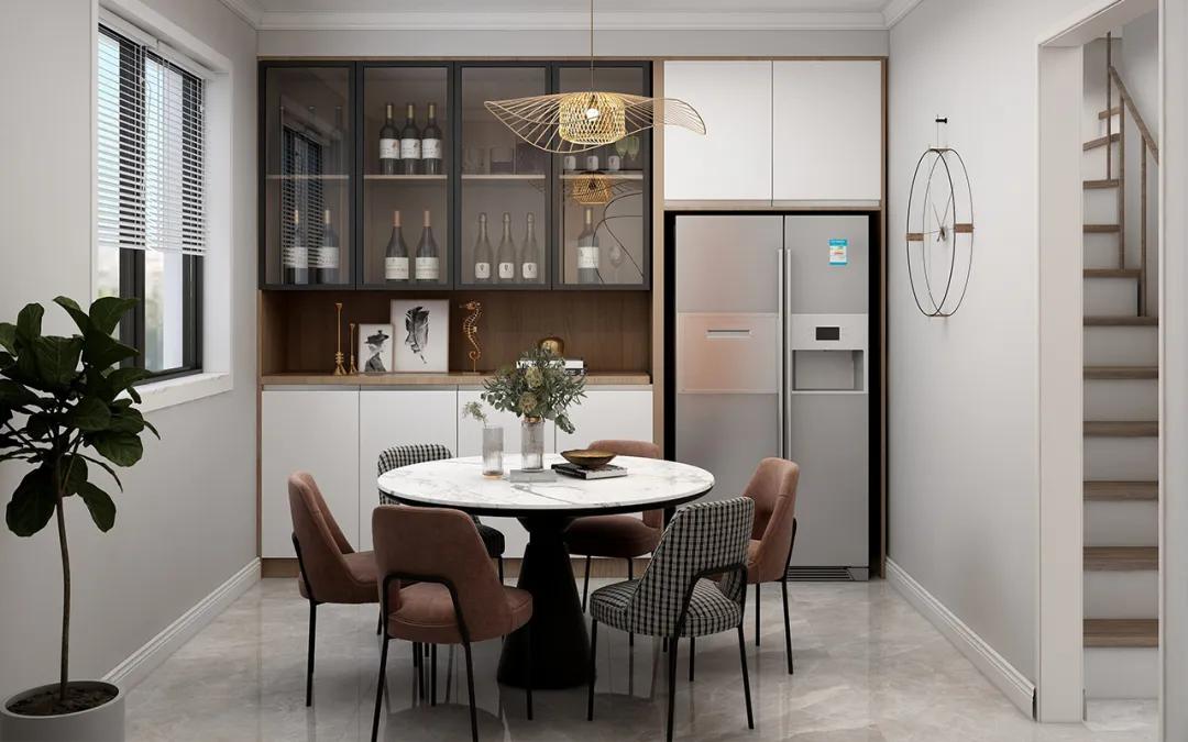本設計案例設計師充分利用了空間,將餐廳設置在樓梯下方,不僅增加了空間的使用效率,還讓餐廳具有了獨特的氛圍。設計師還將唯一整墻設置了一面墻的儲物柜,既方便了餐具和雜物的收納,又增加了空間的層次感。同時,儲物柜中間還設置了一排開放式的隔層,可以擺放一些裝飾品或書籍,為餐廳增添一份文化氣息。