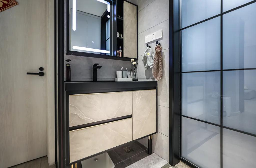 本設(shè)計(jì)采用了奢華風(fēng)格的裝飾和材料,金色邊框的鏡子和條紋狀的大理石板材,與黑色的收納柜形成強(qiáng)烈對(duì)比。黑白灰的色彩搭配,既統(tǒng)一又富有層次。整個(gè)設(shè)計(jì)奢華而大氣。