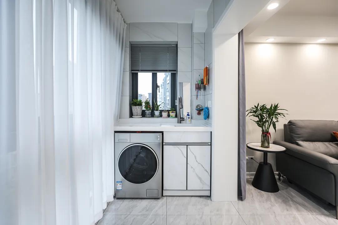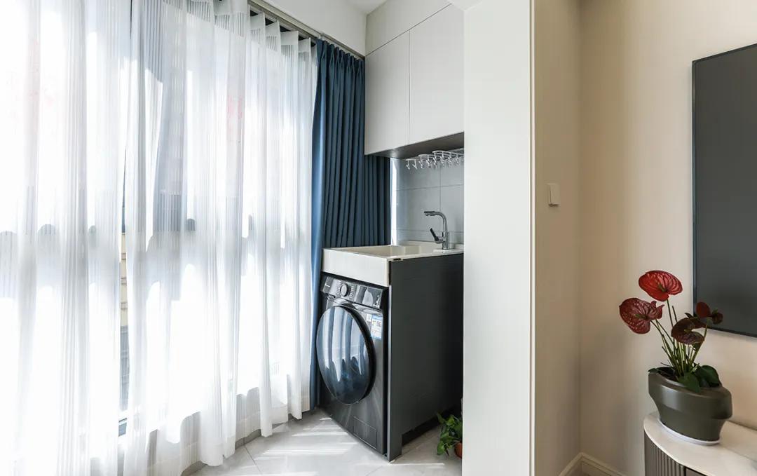 該陽臺注重實用性和舒適性。地面采用防滑的地磚,以保證安全。墻面使用白色紋理瓷磚,增加空間亮度和厚重感。同時采用了洗衣機內嵌設計,使空間有序的同時增加收納空間。陽臺旁擺放了少量的綠色植物,為空間增添生氣。