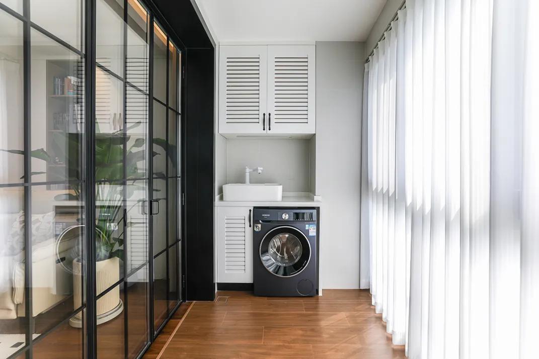 該陽臺地面采用深棕色實木地板,耐看且實用。墻面使用白色涂料,并安裝了洗手臺、儲物架。家電以簡約的制品為主,輕便且時尚。整個空間對比強烈、時尚感十足。