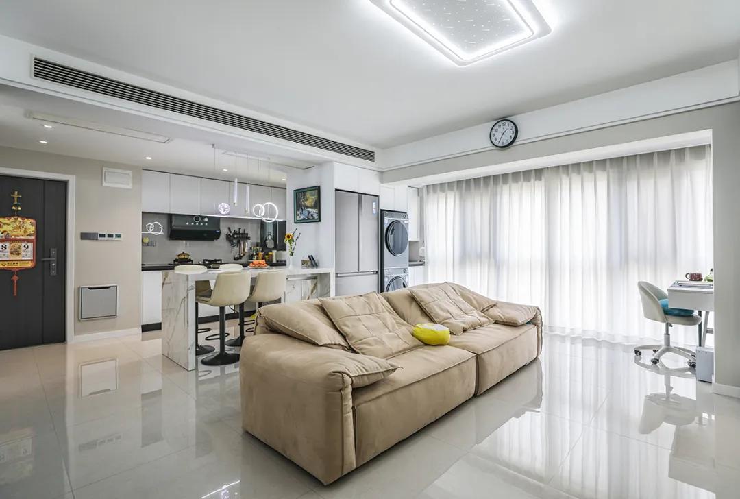 一體化客廳設計+開放餐廳+玻璃門廚房:將客廳與餐廳合并為一個連續的區域,并通過透明玻璃門來分隔廚房。這樣,整個空間都能享受到室外的光感。