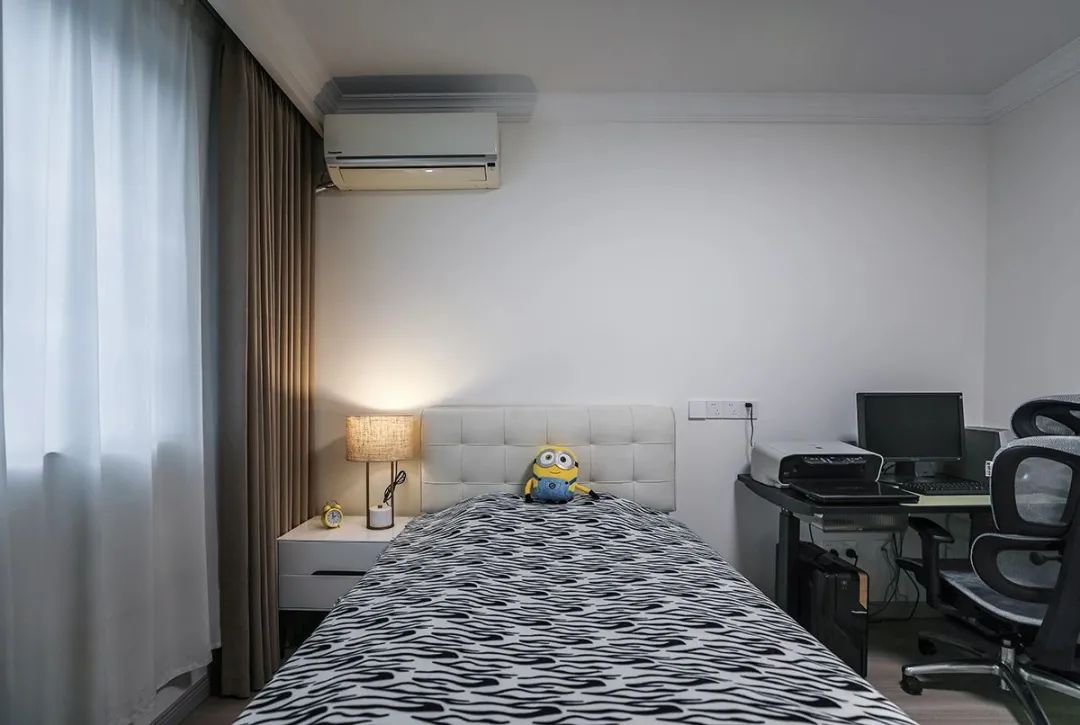 從預算角度考量,臥室我們以簡化的形式處理。吊頂簡約造型、墻面暖白色乳膠漆,避免了過多的裝飾花費。為了增加質感,我們特意選擇了同色系的糯白皮包頭床、白色通頂衣柜,這樣的組合不僅讓空間顯得寬敞明亮,還增加了整體的美觀度。