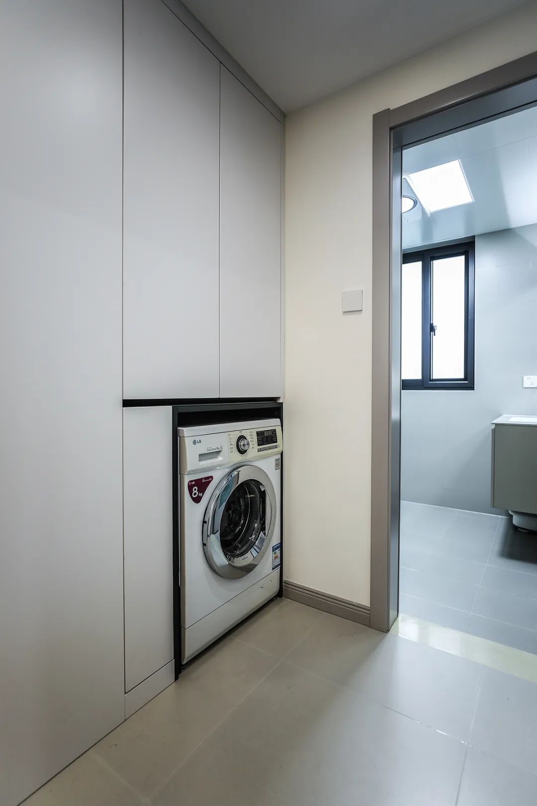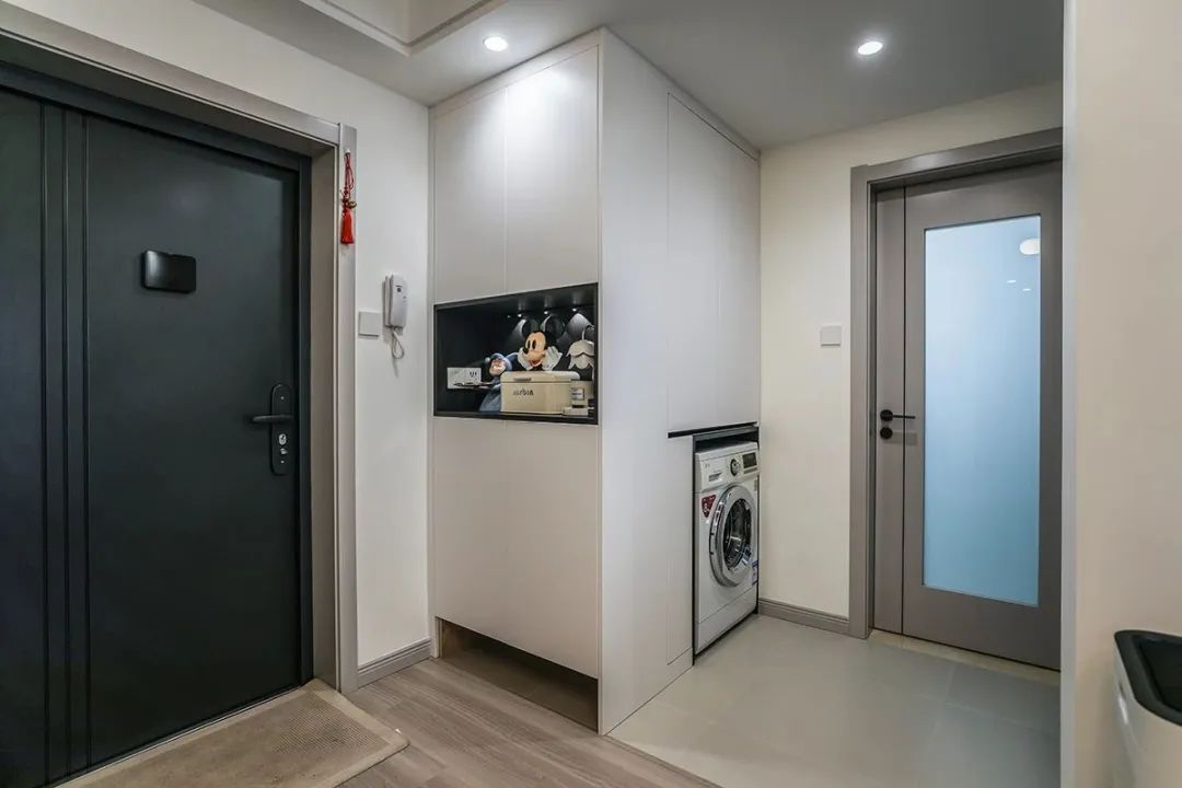 進門玄關處,地面鋪的實木復合地板,左邊定制了能嵌入洗衣機的收納柜,中間鏤空可放置挎包、鑰匙等,底部鏤空處與常規鞋等高方便換室內拖鞋,非常實用。