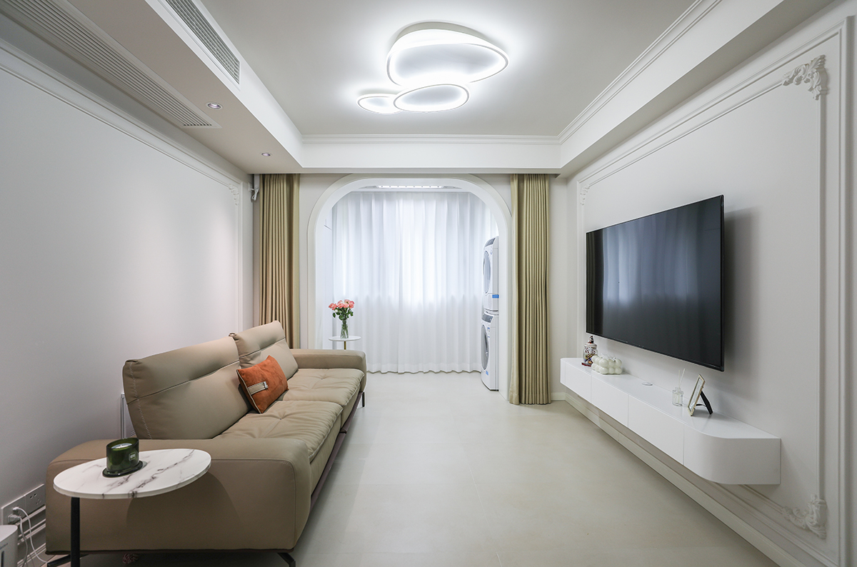 這款現代風格的客廳,其簡潔的設計和明亮的色調令人印象深刻。米色沙發搭配橙色和白色抱枕,增添了活潑氣息。窗簾門半透明設計,既保護了隱私,又讓自然光線柔和地進入室內,美觀又實用。