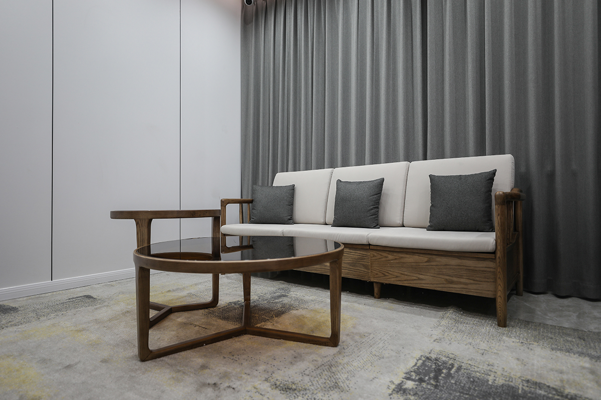 實木坐墊沙發搭配灰色的抱枕,營造出溫馨舒適的氛圍。灰色窗簾的柔軟質地和垂墜感不僅增添了美感,而且能有效調節光線,保證隱私。深棕色圓形茶幾與地毯的幾何圖案相映成趣,凸顯了空間的現代感。整體設計注重細節與實用性的結合,為客戶提供了既美觀又舒適的居住體驗,窗簾的搭配更是提升了整個空間的品質。