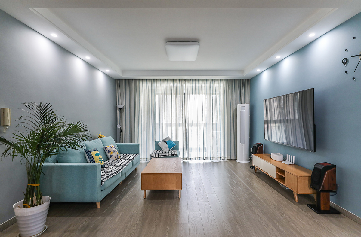 該客廳以藍色和白色為主色調,深色木地板與淺灰色墻壁相映成趣,增添了空間的層次感。窗簾作為點睛之筆,選擇了白色或淡灰色系,既與整體風格相協調。同時,窗簾的輕盈質感與房間的綠植、鮮花相映生輝,提升了整體美感。