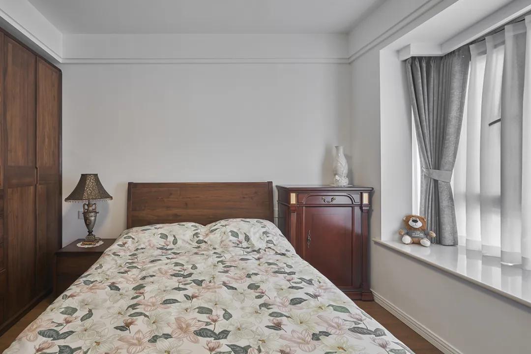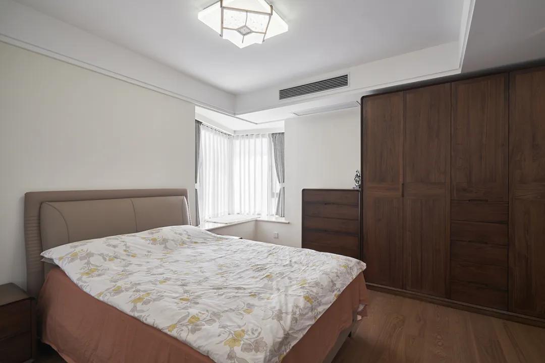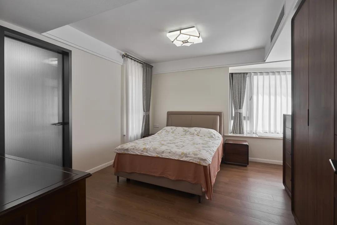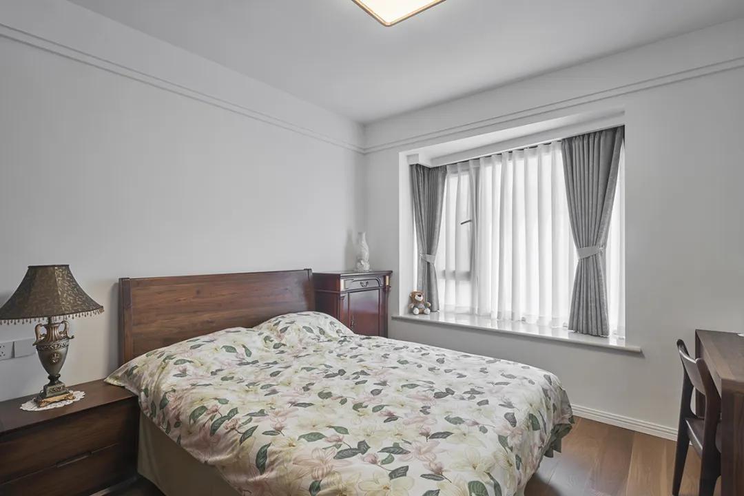 臥室整體色調(diào)以白色和深色木質(zhì)為主,顯得簡潔而明亮。米色的床頭板和棕色床頭柜的搭配增添了溫馨感。窗戶的灰色窗簾不僅遮光效果好,還能為房間增添一抹柔和的色彩。