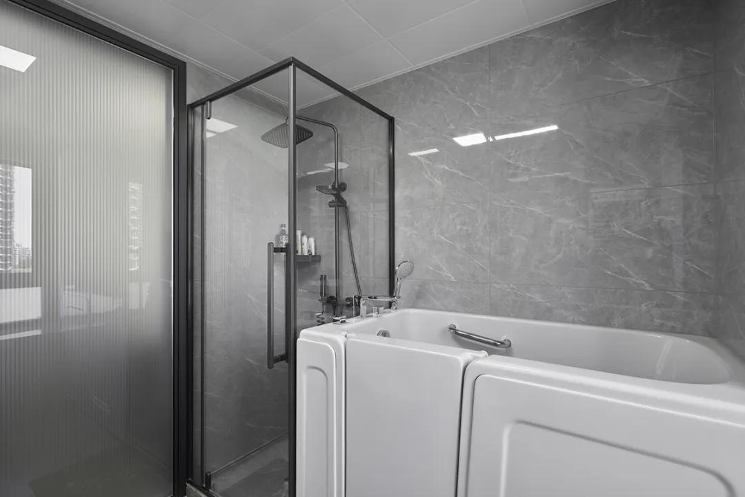 這個浴室設(shè)計簡約而精致,灰色大理石瓷磚的鋪設(shè)營造了一種高質(zhì)感的氛圍。淋浴房采用透明玻璃設(shè)計,不僅增加了空間的通透感,還便于清潔和維護。黑色的淋浴頭搭配洗浴用品,展現(xiàn)了一種低調(diào)的奢華。