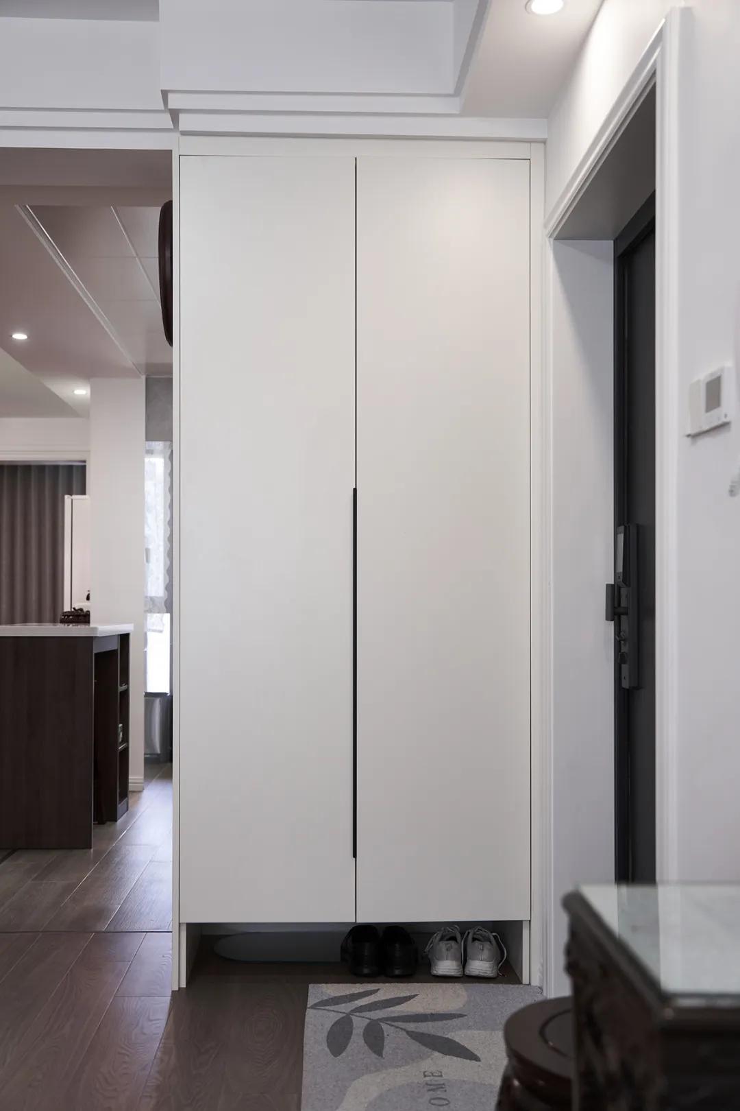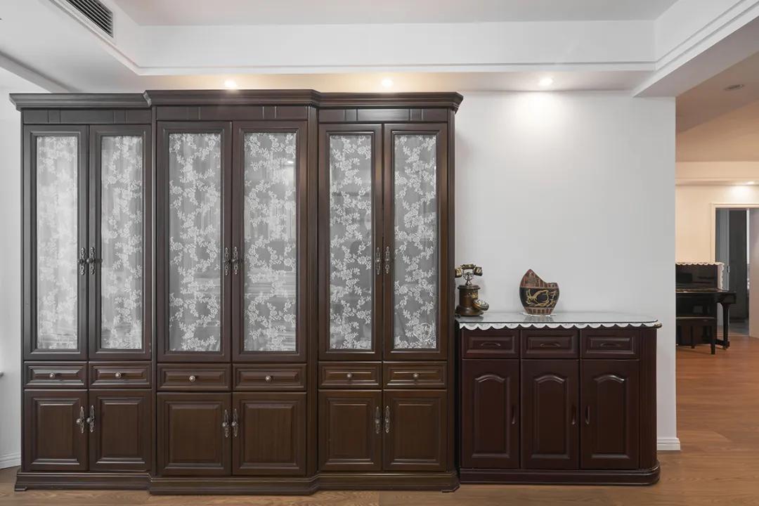 玄關(guān)區(qū)域以深棕色木質(zhì)衣柜為主,門上的白色蕾絲圖案增添了優(yōu)雅氣息。旁邊的木質(zhì)小柜子以及復古電話,都透露出一種精致的古典美。整個空間與白色墻壁形成鮮明對比,營造了一種溫馨而優(yōu)雅的氛圍。