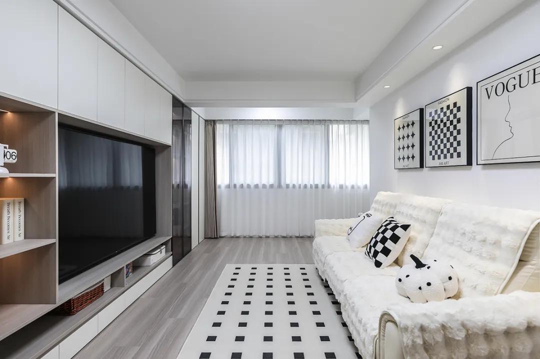 該居室是一對年輕夫妻做婚房,男主人是建筑企業評估員,女主人是幼兒園老師,喜歡養貓。該客廳電視背景墻做收納柜內嵌電視,沙發背景用淺灰色涂料,都體現了原木奶油的柔和自然美。