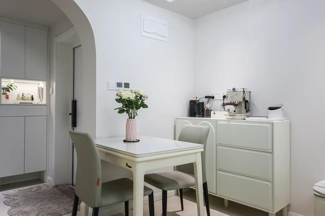 餐廳放一個700*1200的小餐桌,平時家里只有2個人吃飯,夠主人用,白色巖板臺面,奶咖色桌椅,白色的椅子,上方小吊燈,很靈活輕巧。