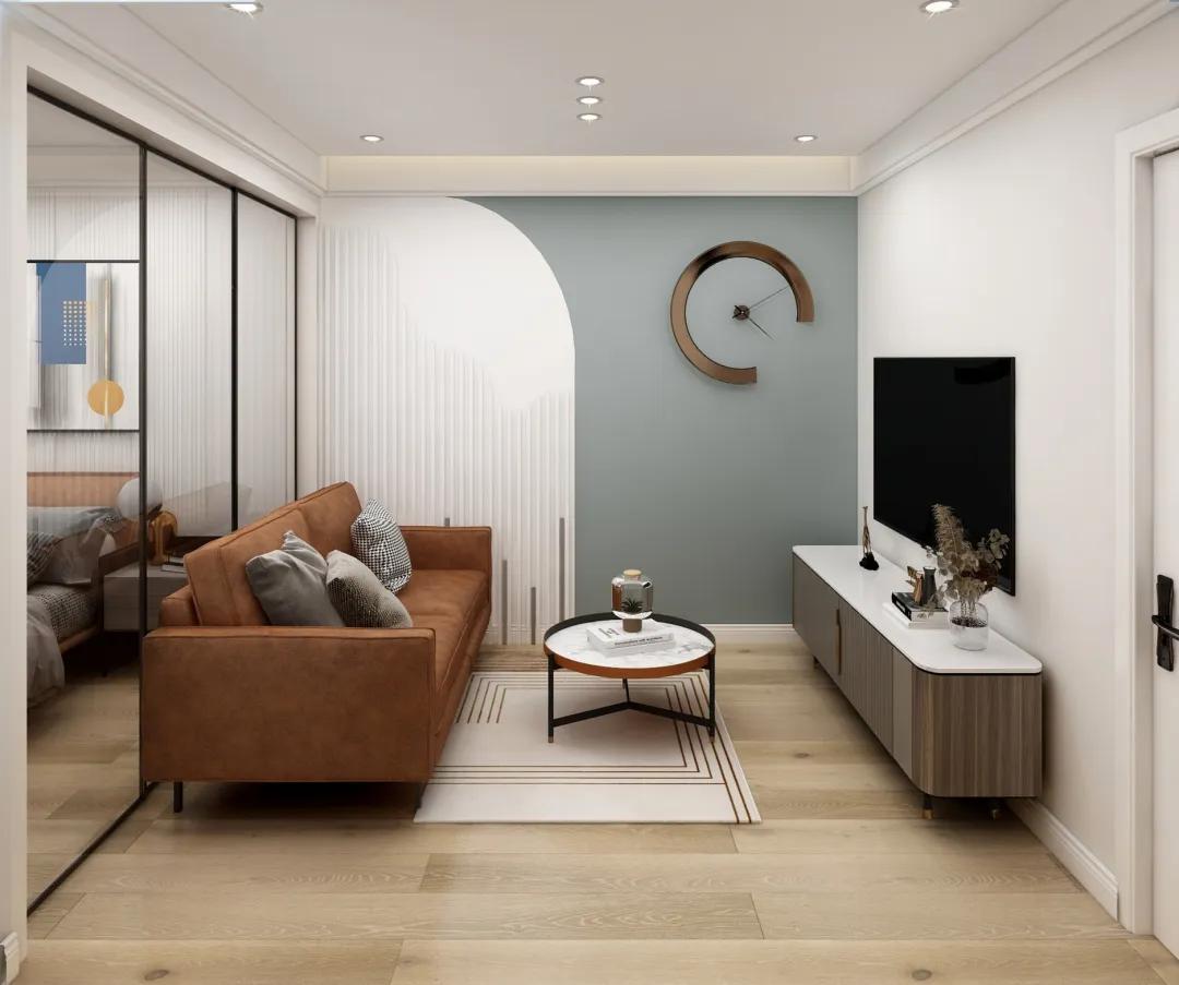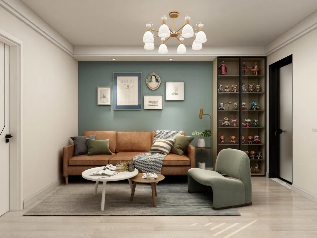 柔和的色彩搭配不僅擴大了空間感,更在夏日炎炎中為居者帶來了清新涼爽的居住體驗。這套室內裝潢采用棕色沙發與綠色沙發椅的點綴,增添了層次與活力;白色畫框與金色壁燈相互映襯,優雅而不失溫馨。淺色墻面不僅視覺上降溫,更提升了整體家居的舒適度和實用價值。