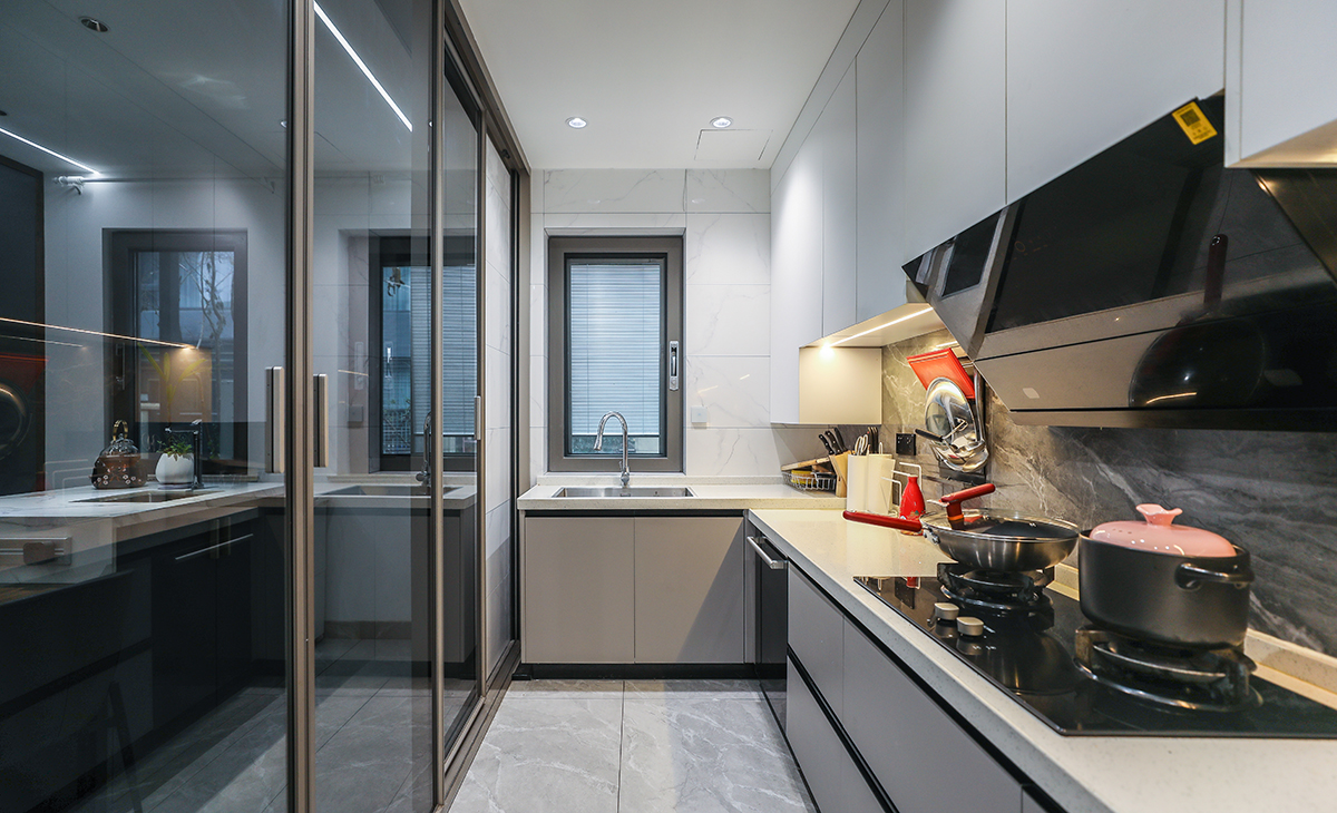 該廚房玻璃門(mén)隔斷不僅巧妙劃分了空間,還極大地增強(qiáng)了室內(nèi)外的通透感,讓自然光線充分滲透,瞬間提升家居的明亮度和寬敞度。綠植的點(diǎn)綴為廚房增添生機(jī)。白色大理石紋理櫥柜與黑色電器形成鮮明對(duì)比,彰顯高雅品味。