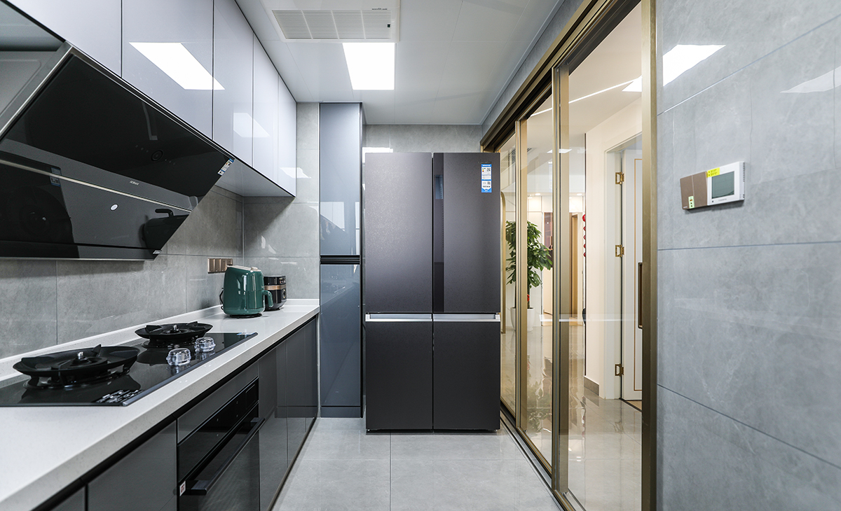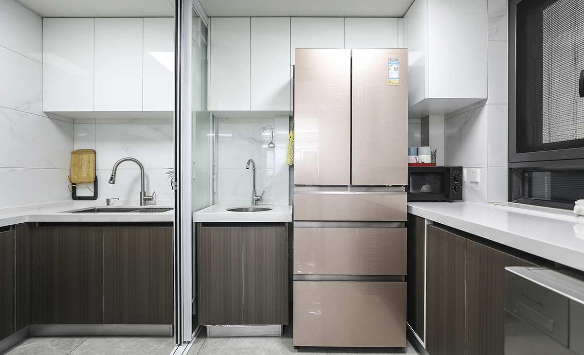 該廚房灰色與白色的基調(diào)搭配黑色家電,營(yíng)造出一種清新而不失高級(jí)感的空間氛圍。玻璃門(mén)隔斷有效提升空間的通透性和光線感。玻璃門(mén)不僅能夠模糊室內(nèi)外界限,引入更多自然光,使廚房顯得更加明亮寬敞,還能在小戶型中創(chuàng)造出更加開(kāi)放、流動(dòng)的視覺(jué)效果,增強(qiáng)整體的居住舒適度。