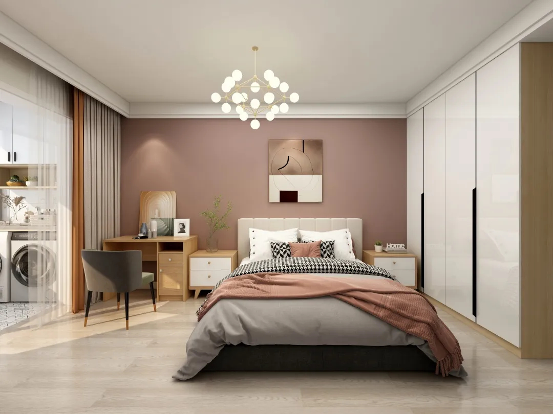 這套案例具有豐富的色彩,特別是暖色系,如粉色和灰色的乳膠漆墻面,搭配木色地板和灰色床品,營造出一個(gè)浪漫而清新的少女心臥室。這種色彩搭配不僅增加了空間的舒適度,更增添了一種爛漫的感覺,讓居住者感受到家的溫馨和浪漫。
