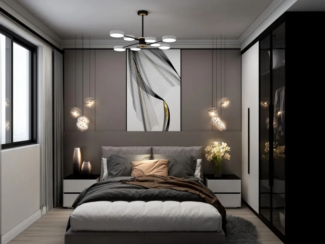 這個(gè)房間背景墻以黑色和灰色為主色調(diào)的背景墻,搭配金屬材質(zhì)的裝飾品,展現(xiàn)出工業(yè)風(fēng)格的獨(dú)特質(zhì)感。分割式裝飾元素的使用,不僅增加了空間的層次感,更讓整個(gè)空間顯得更加溫暖和有質(zhì)感,為居住者提供了一種現(xiàn)代而又不失溫馨的居住體驗(yàn)。