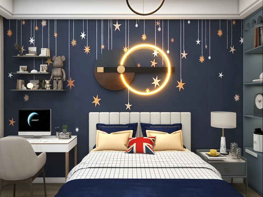 該臥室深藍(lán)色和白色的背景墻設(shè)計(jì),帶來寧靜和神秘感。星星裝飾和燈光設(shè)計(jì)模擬星空效果,營造出一種仿佛置身于宇宙之中的感覺,增添了浪漫和溫馨的氛圍,為居住者提供了一個(gè)夢幻般的休息空間。