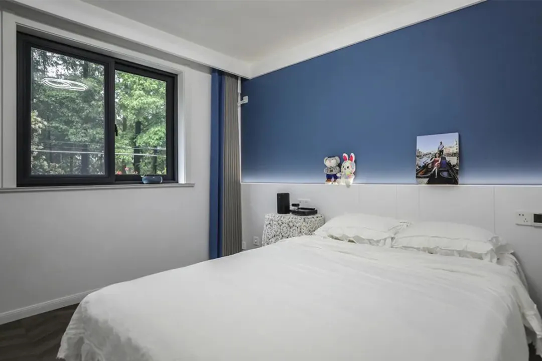 這套房根據業主的喜好采用的是奶油風裝修風格,而且業主對海洋、對海洋藍色情有獨鐘,由于海藍色和奶油白色對比度比較大,一般很少采用將這兩種顏色作為大面積色使用,為了滿足客戶的喜好和要求我們將床頭背景用海藍色、其它三面墻用白色,背景藍色做了簡單的燈光處理,將藍色漸變化,消解一些藍色,讓藍色融入整個奶油風格中。窗簾也采用了海藍色窗簾,這樣可以通過光的折射讓奶油白墻上也多了一些藍色的靈動,兩種顏色很好的溶解在一起,更顯和諧。