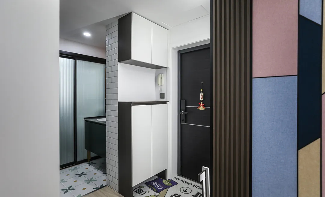本套房子面積65㎡,平時只有男主一人居住,我們用用幾何抽象色彩打造個性一人居。玄關處地板和墻面我們選用較為鮮艷的色彩裝飾,不僅增添了空間的活力與趣味性,也巧妙地引導了視覺流動,使空間顯得更加寬敞明亮。浴室門的半透明設計,在保證隱私的同時,也引入了自然光線,使得浴室區域更加通透。