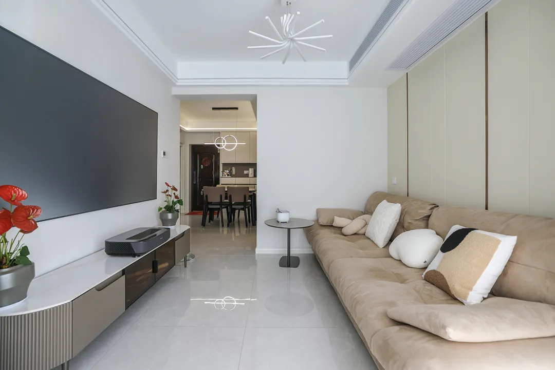 1、客廳采用簡(jiǎn)約設(shè)計(jì),暖色調(diào)布藝沙發(fā),雙眼皮吊頂和線條燈增加層次和氛圍感。