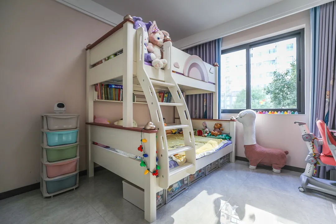 兒童房上下床的設(shè)計(jì)兩孩的居住問題,床下的置物柜滿足了玩具收納。