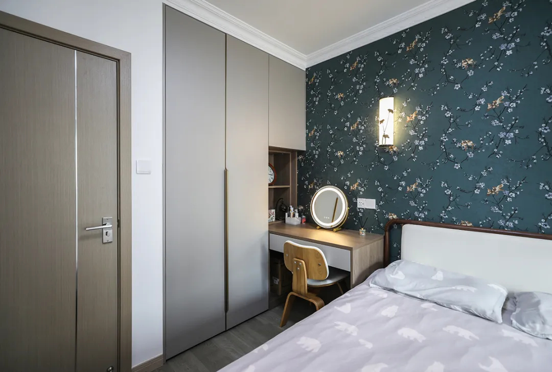 該臥室采用自然簡約的設計主題,通過運用大量天然材料和簡約家具,營造出一個輕松愉悅的臥室空間。墻面裝飾以圖案墻紙為主,搭配原木色調的家具,營造出一種自然而溫馨的氛圍。設計亮點在于取消了傳統的床頭柜,改為在通頂衣柜中設計凹槽,創造出一個專屬的化妝臺,既節省空間又增加了收納功能。