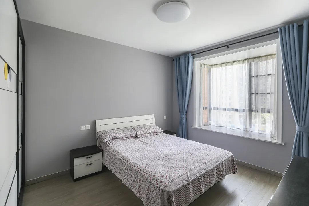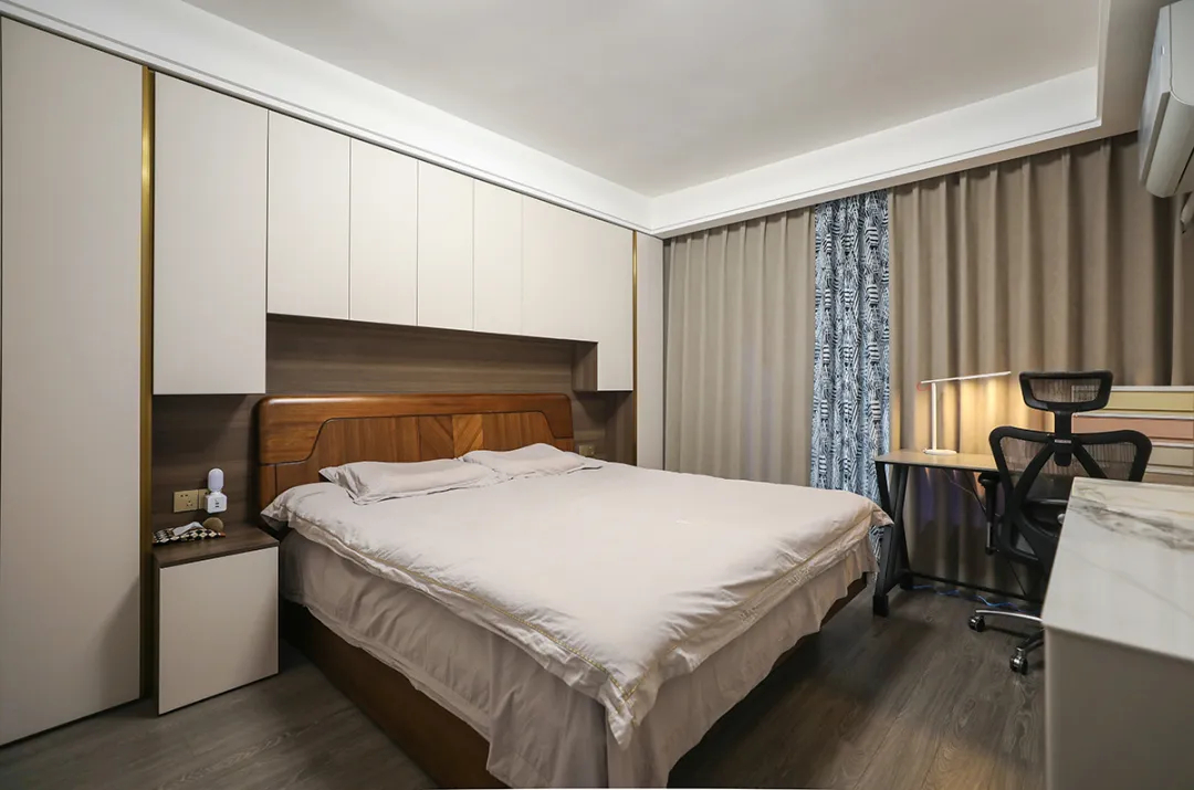 本案著重表現簡約風格中的“簡”字,通過淺色調的涂料和原木色地板的搭配,營造出一個自然舒適的臥室環境。軟裝方面,選擇了通頂家具和舒適的床品,使空間在保持簡約的同時,也不失溫馨和舒適感。