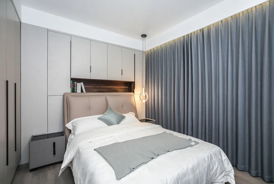本套房設計追求簡約而不簡單的設計理念,臥室以白色和灰色為主色調,整個空間沒有多余的裝飾,強調線條的流暢和空間的有效利用。大面積的落地窗設計,為室內帶來了充足的自然光線,營造出一個明亮、整潔的居住環境。
