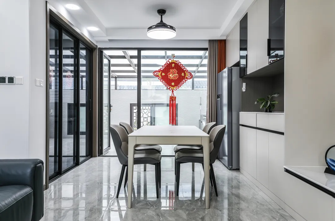 新中式風餐廳:此設計采用傳統新中式風格,結合傳統元素和現代設計,注重材質和細節的處理。由于空間有限,餐廳采用開放式設計。餐桌和椅子選用深色木質,搭配實木板材墻面、臺桌、藝術裝飾畫,營造出傳統而典雅的用餐環境。吊燈選用古典的中式風格,與整體空間風格相協調。