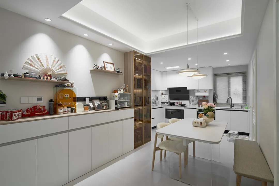 日式原木風餐廳:餐廳空間原本連著陽臺,陽臺小而無用,餐廳空間也極其拮據。于是我們把原有的陽臺敲掉,在左邊放了一個冰箱,右邊放了一個玻璃柜,配上原木色的餐桌和椅子,這樣讓餐廳空間更明亮、寬敞,用餐也更顯溫馨舒適。