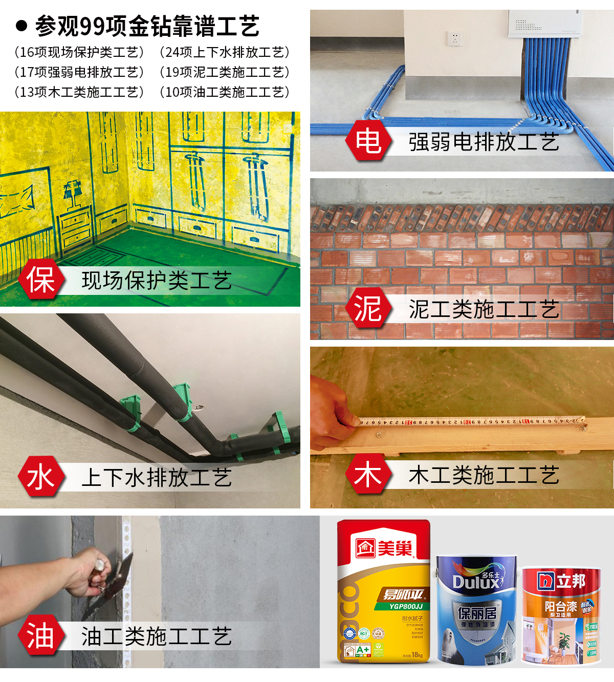 泥工是家裝中的基礎工程,其質量直接影響到整個裝修的效果和使用壽命。19項泥工類歐標施工工藝,從材料選擇、配比、攪拌到施工、養護,每一個步驟都精益求精,確保墻面、地面的平整度和牢固度,可抗滲漏、抗潮霉、抗開裂、抗溫差、抗變形等,確保裝修的新家穩固且耐用。