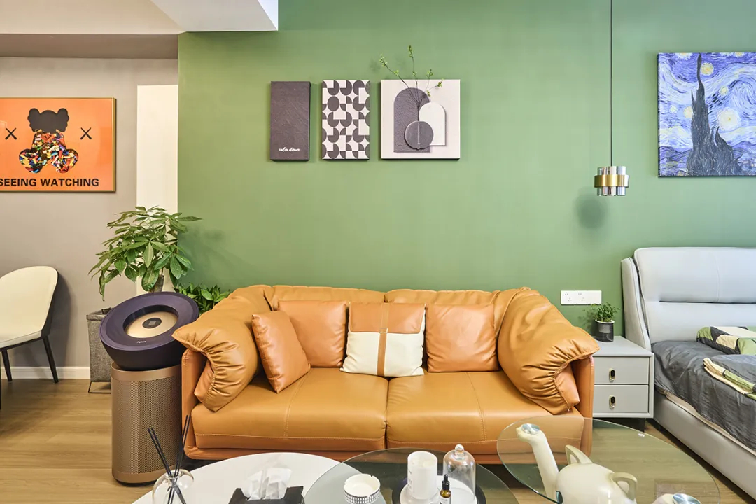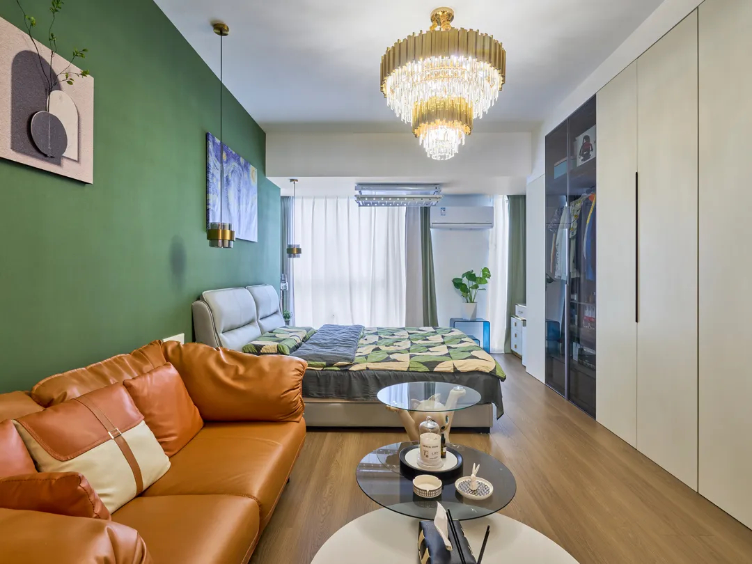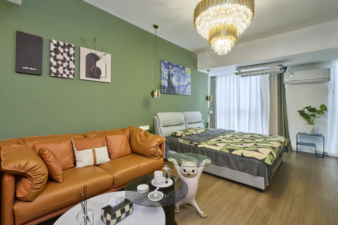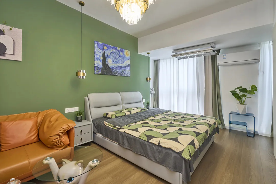 睡眠區以綠色墻面和灰色皮革相呼應,為家增添了一抹活力。窗簾的設計也是一個亮點,棕色和灰色的布簾搭配白色的紗簾,讓整個空間瞬間明亮起來。