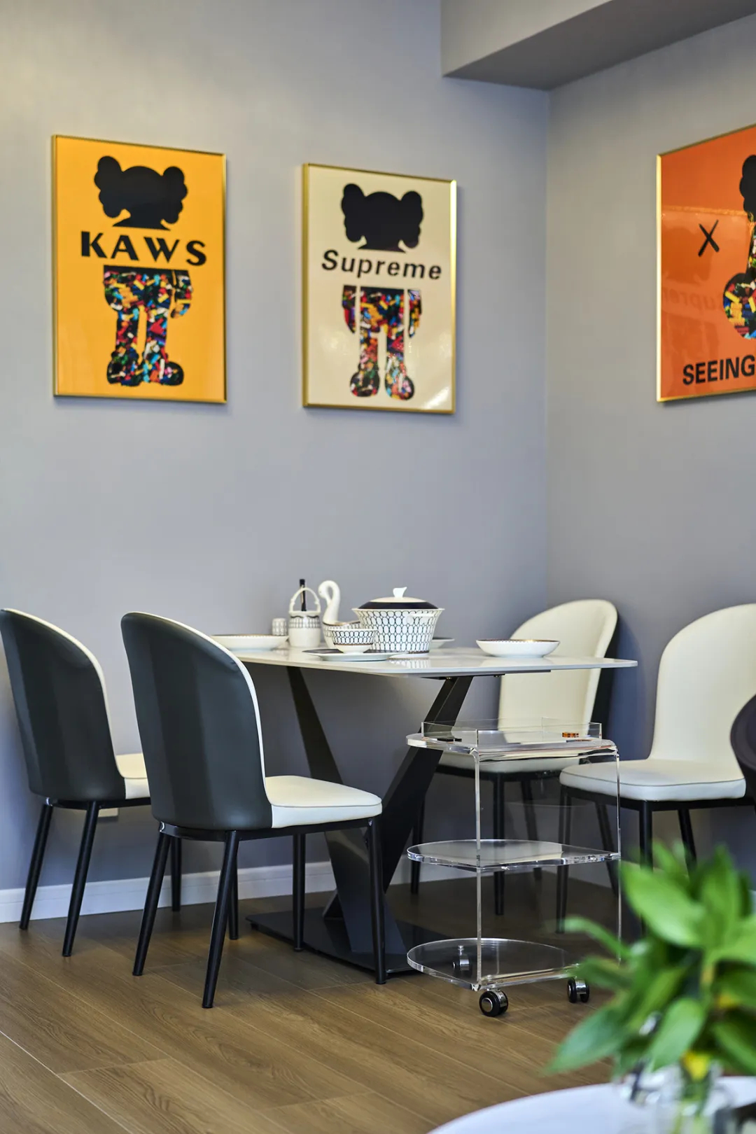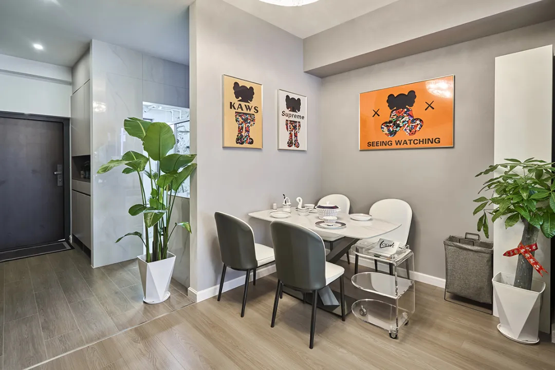 餐區采用小戶型常見的角落餐廳設計,一張簡約的餐桌搭配創意坐椅,既滿足了用餐需求,又不占用過多空間。墻面上的藝術裝飾和懸掛的吊燈,為這個小角落增添了一抹溫馨和個性。