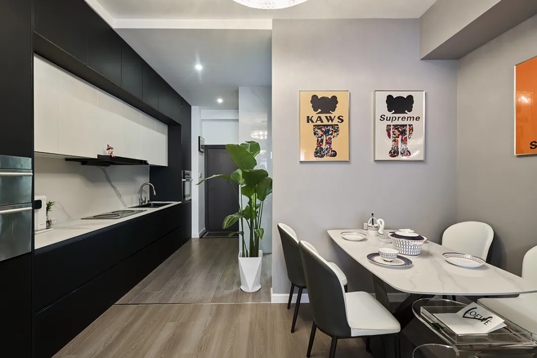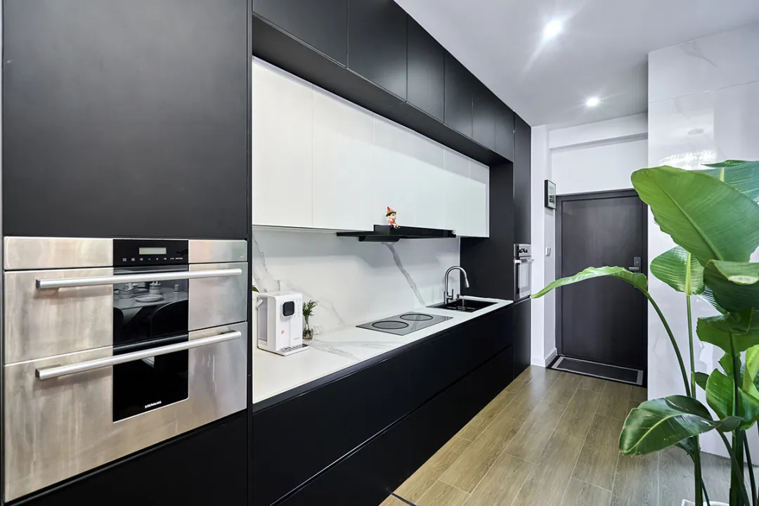 廚房區域設計成了一字型櫥柜,配備了蒸烤一體機,上柜下柜均為深灰色,與白色的吊柜和巖板臺面形成鮮明對比,大氣而不失精致。