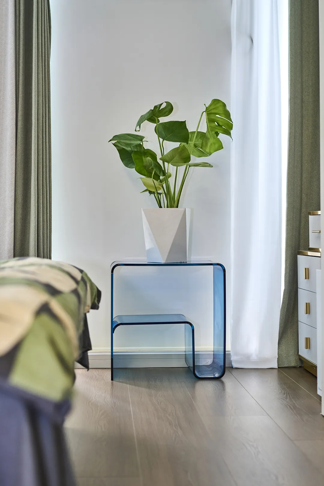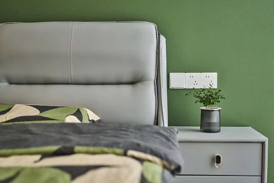 我們還通過軟裝的精心搭配,來提升小空間的高級感。如灰色床頭板與綠色床品的撞色設計,以及床頭柜上裝飾性的綠植,通過裝修細節增添空間的現代氣息。