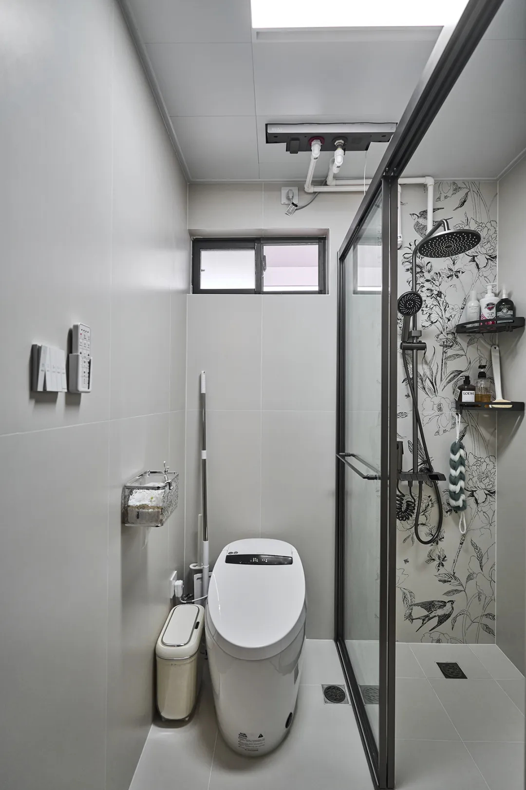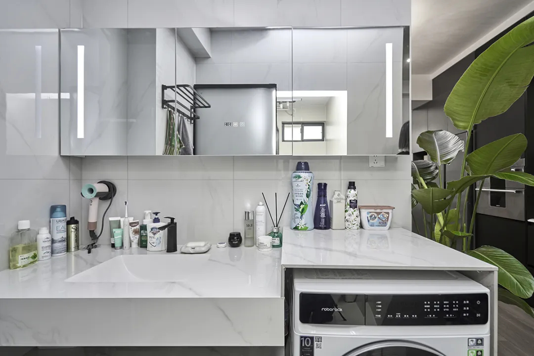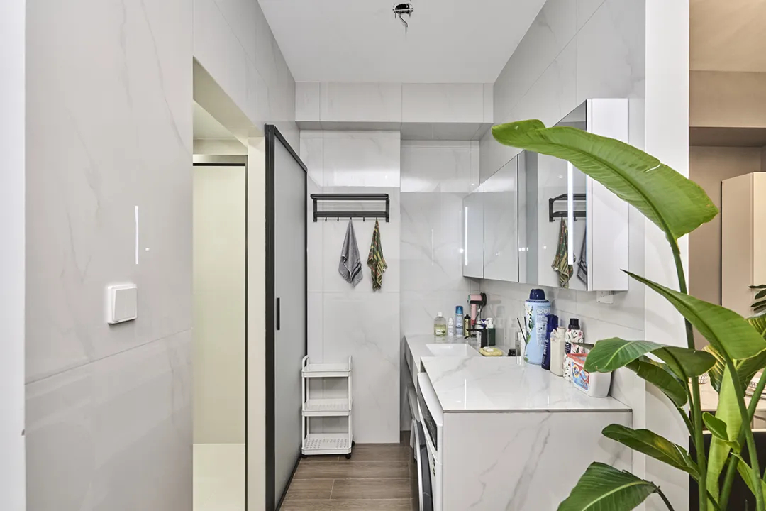 洗手臺根據客戶原有洗衣機高度和宅主生活習慣,采用高低臺設計,既符合人體工程學,又能定制化空間,讓空間干凈整潔。濕區采用槍灰色邊框淋浴房和純色墻磚,避免過于花哨的設計,讓衛生間顯得既現代又寬敞。