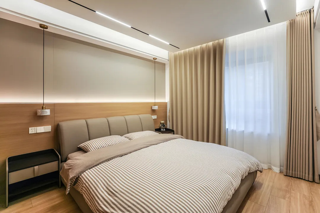 這套房主臥地面鋪的實(shí)木復(fù)合地板,房頂采用懸浮無(wú)主燈+線(xiàn)性燈。背景墻選了現(xiàn)在比較流行的硬包+原木色墻板。柔和的色調(diào),半墻造型點(diǎn)綴燈帶線(xiàn),讓家里氛圍感更純粹。皮革硬包+原木色木飾面+燈帶,見(jiàn)光不見(jiàn)燈,配上咖啡色的窗簾和白沙,整個(gè)空間層次明晰。