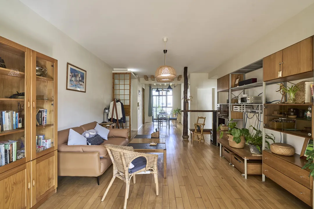 該套房業主夫婦是藝術家,他們偏愛原木的自然質感,原有家具和地板多是實木材質,并希望我們保留這些元素,以維持家居的自然風格和藝術氣息。了解了業主的藝術追求和生活品味后,我們以日式原木風格為基礎,精心規劃設計了該居室。