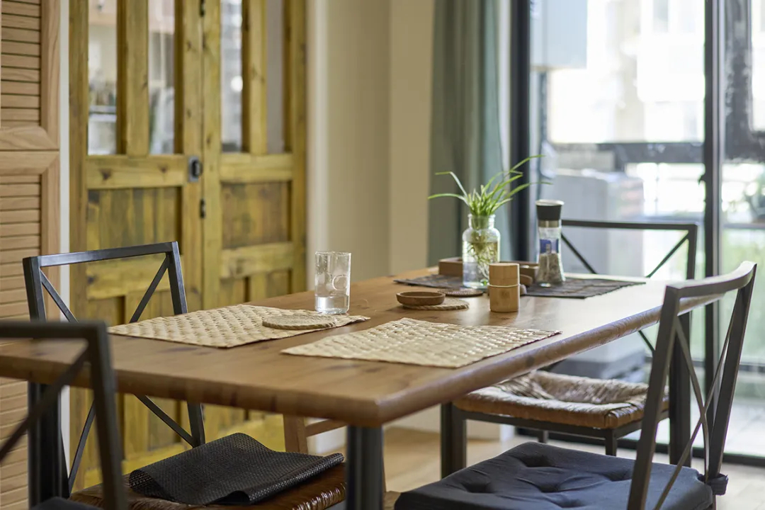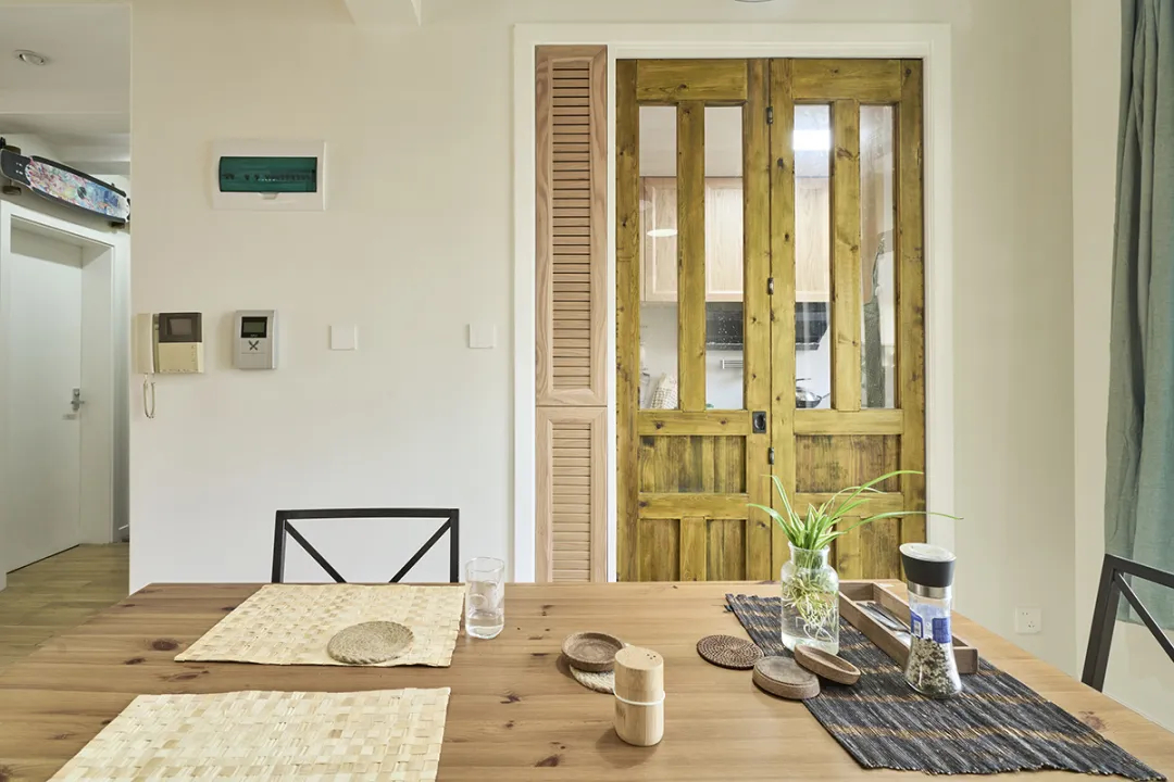 背景中的木門設計簡潔大方,與整體風格相得益彰,同時透過門縫透出的自然光線,讓空間光感十足,為餐廳增添了一抹溫馨。