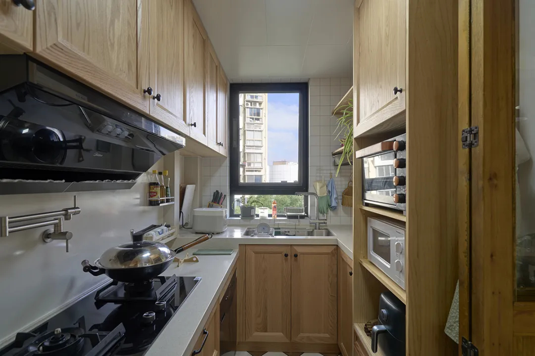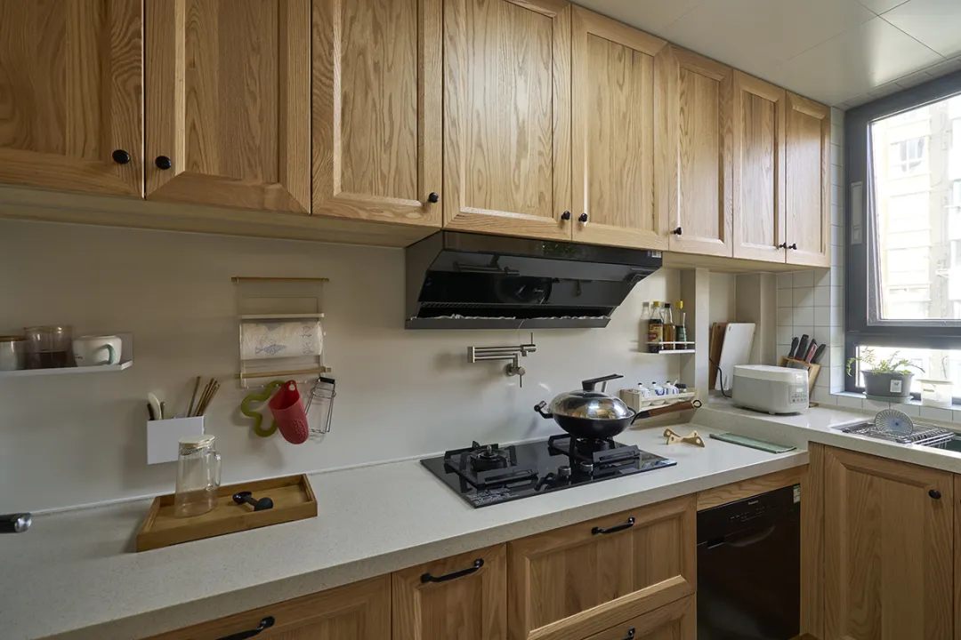廚房設計得既整潔又實用,木質櫥柜與白色臺面的搭配,營造出一種溫馨而明亮的氛圍。櫥柜上方的抽屜和柜子提供了充足的儲物空間,使得廚房物品能夠有序擺放,方便取用。